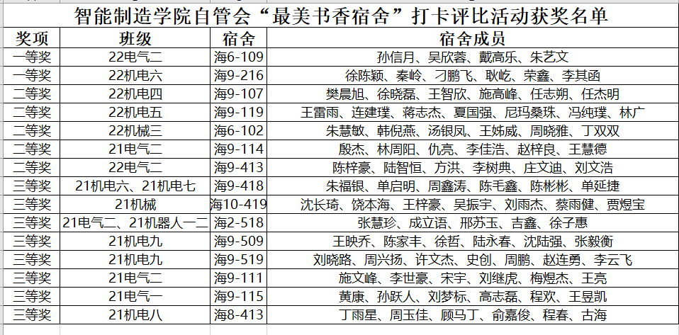 为加强宿舍文化内涵建设,使学生具备文明生活的基本素养,营造和谐健康的宿舍生活与学习环境,11月14日至11月20日,智能制造学院组织了“最美书香宿舍”品牌活动。