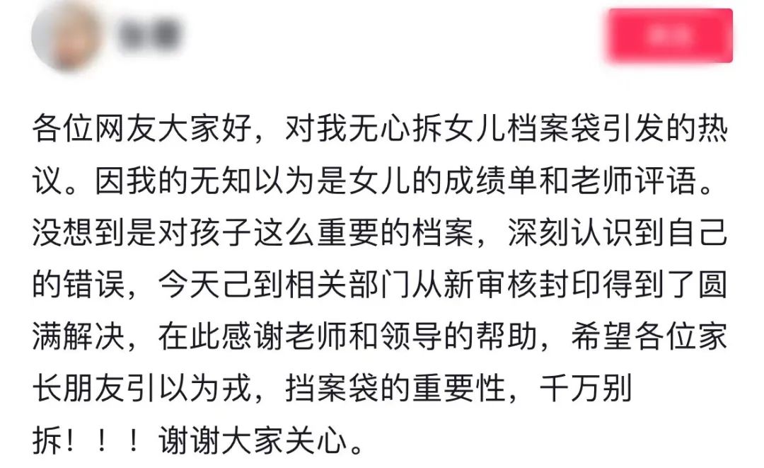27日下午,记者联系上这位母亲张女士。张女士称,档案是大女儿的,事发在26日,当时就是不小心给拆开了。目前,正在对这件事情进行补救。