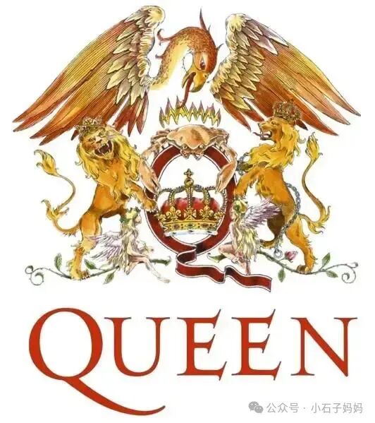 左右两只狮子分别代表狮子座的鼓手罗杰泰勒和贝斯手约翰迪肯,上面的螃蟹是代表巨蟹座的吉他手布莱恩梅,下边的两个女子是代表牙叔本人的处女座,中间是Queen的首字母Q,最上边是一只凤凰,寓意Queen。