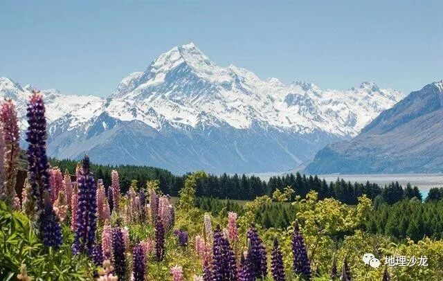 新西兰地处板块的消亡边界,属于环太平洋消亡边界组成部分,由于受到印度洋板块和太平洋板块之间的强烈碰撞挤压,使得新西兰地形以丘陵、山地为主,约占国土面积的75%,平原分布在岛屿四周。位于南岛南阿尔卑斯山脉中的库克山是新西兰的最高峰,海拔3754米,山顶有冰川覆盖,新西兰的山地是由于板块碰撞形成的褶皱山脉,所以山势通常十分险峻,气势磅礴。
