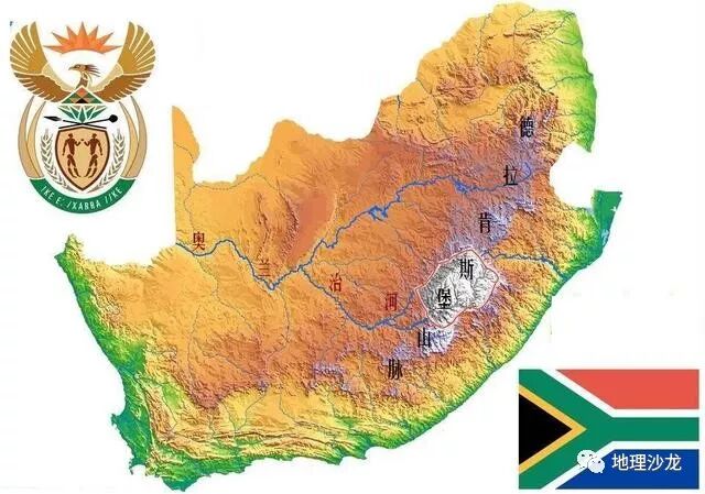 南非的地形以高原地形为主,属于南非高原的组成部分,南非东部有德拉肯斯堡山脉,地势较高,南非整体地势呈现东部向西部倾斜,周围沿海地区地势相对较低,海岸线较平直。南非的纬度范围介于南纬22°至35°,南非全境大部分地区受副热带高气压带控制,大部分地区的气候类型为热带草原气候,德拉肯斯堡山脉阻挡了来自印度洋的水汽,使得南非越往西部降水越少,西北部地区分布有沙漠,其中的纳马夸兰沙漠是多肉植物的故乡。南非的西南端夏季受副热带高气压带控制,冬季受西风带控制,形成地中海气候。