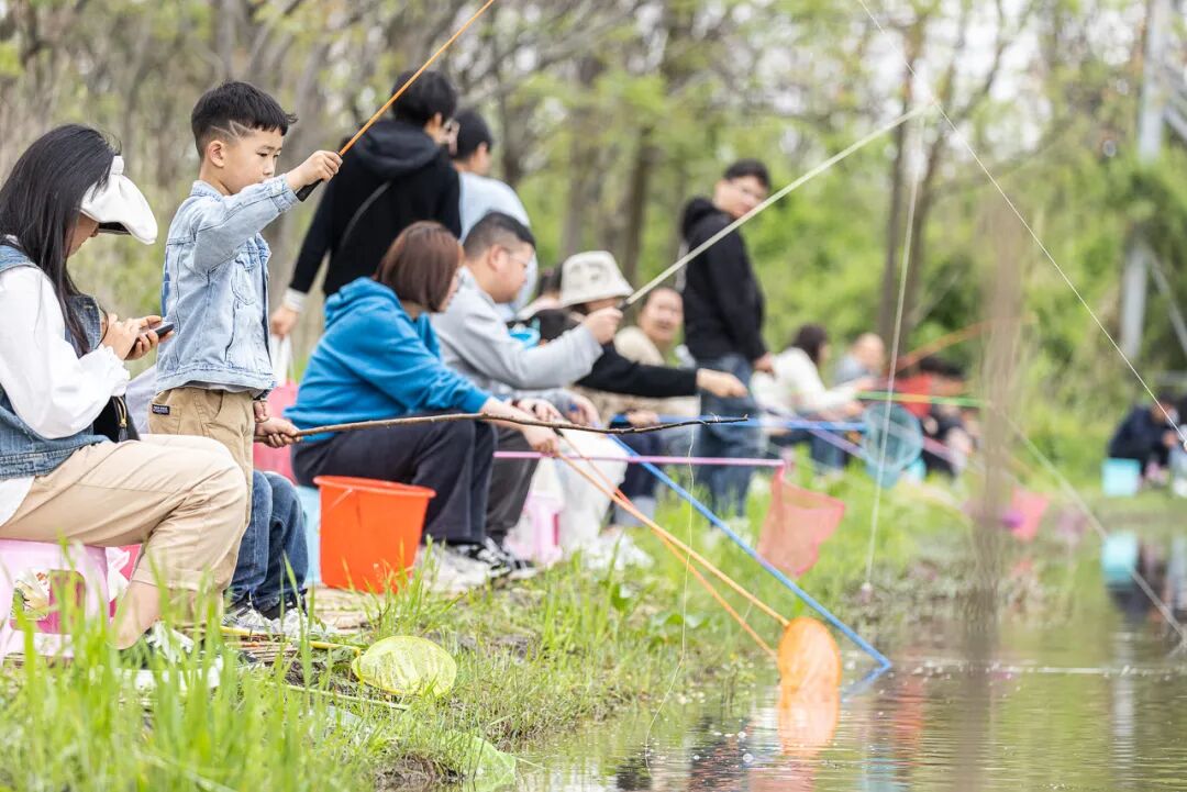 在齐心村龙虾垂钓基地,市民游客携家带口,分工协作钓龙虾,共度欢乐的亲子时光。