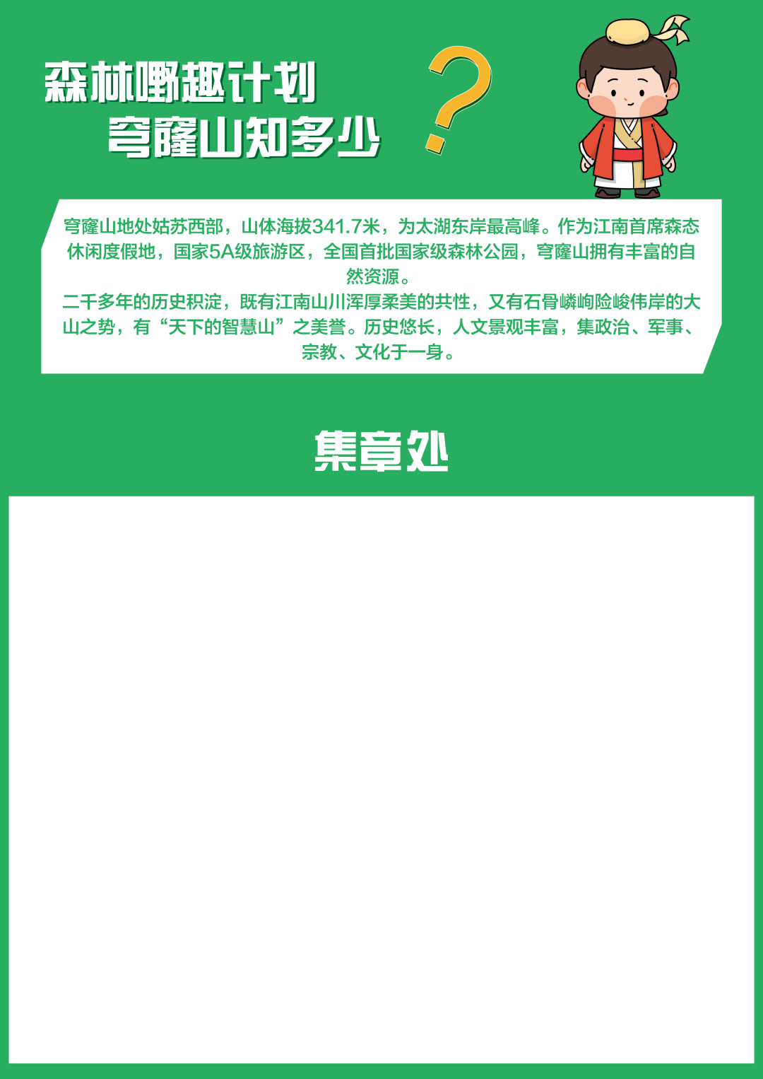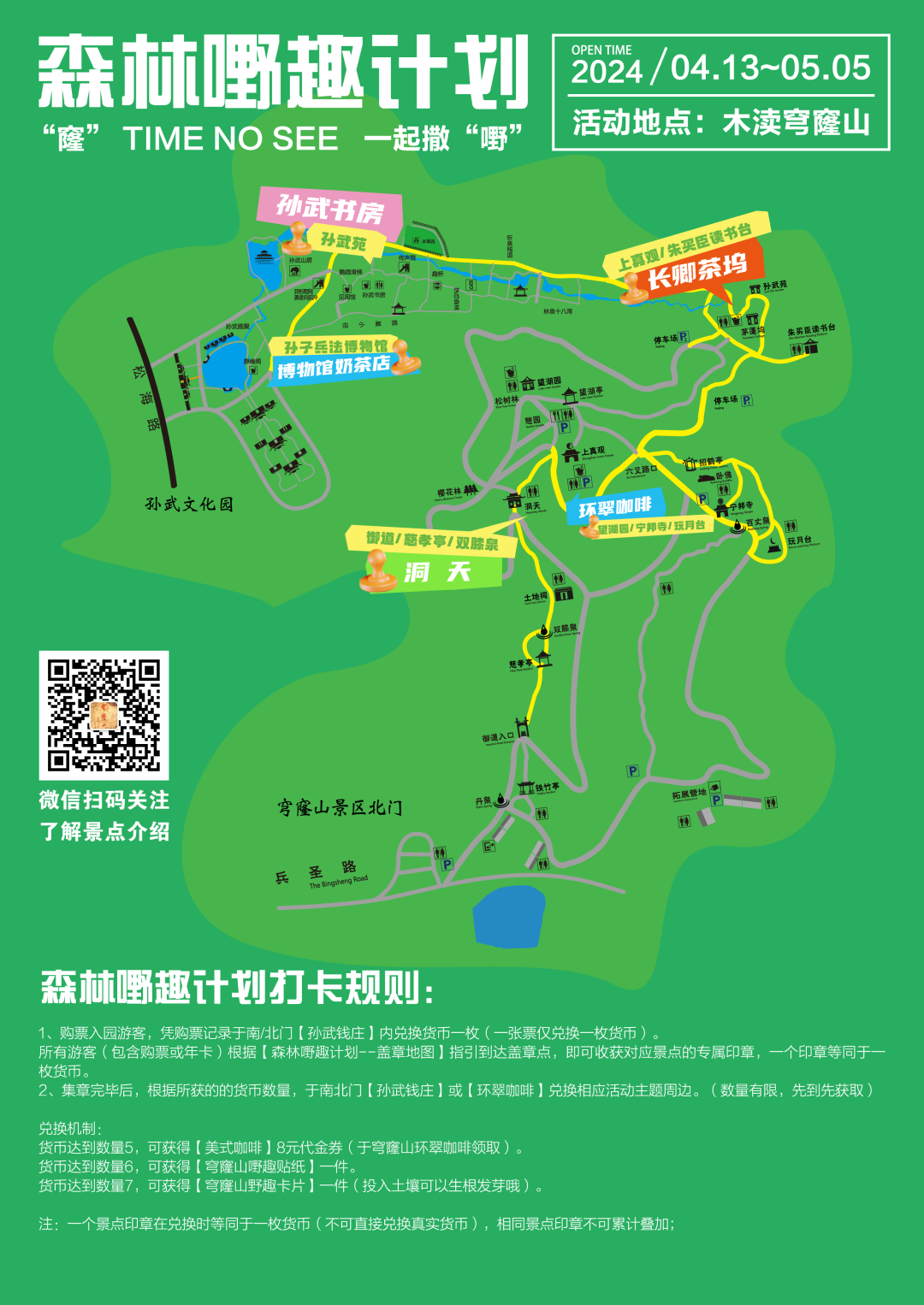 探山游客在孙武钱庄领取【森林嘢趣计划——盖章地图】一份,根据指引到达盖章点,收获对应景点专属印章,一个印章等同于1枚货币。