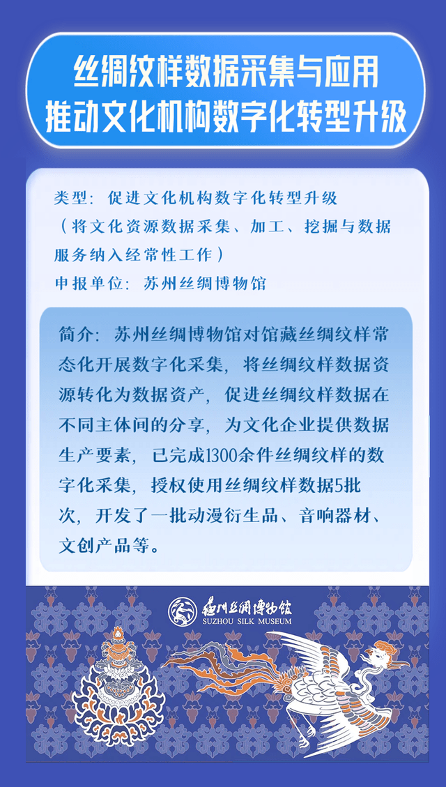 苏州丝绸博物馆“丝绸纹样数据采集与应用推动文化机构数字化转型升级”和百度“百度文心大模型创新文化产品生产方式”均为2023年文化和旅游数字化创新示范十佳案例。