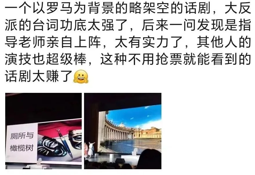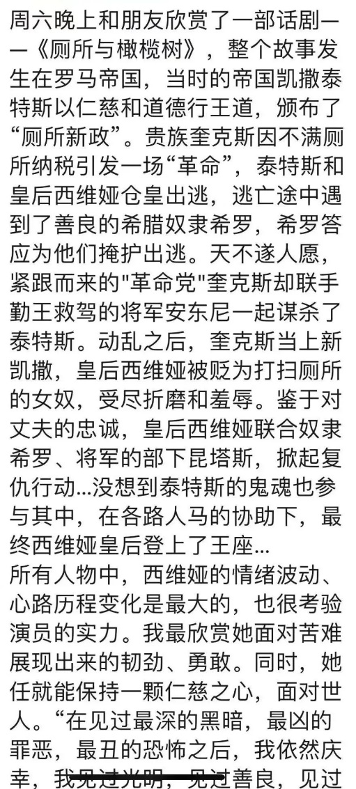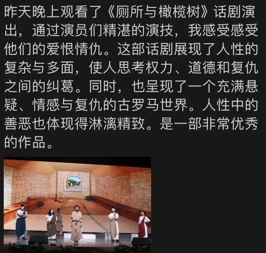 昨天晚上观看了《厕所与橄榄树》话剧演出,通过演员们精湛的演技,我感受感受他们的爱恨情仇。这部话剧展现了人性的复杂与多面,使人思考权力、道德和复仇之间的纠葛。同时,也呈现了一个充满悬疑、情感与复仇的古罗马世界。人性中的善恶也体现得淋漓尽致。是一部非常优秀的作品。