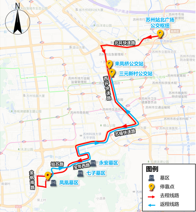 去程线路:苏州站北广场公交枢纽、苏站路、(北环路)跨线桥、北环路、北环快速路、西环快速路、苏福快速路、苏福快速路长江路出口下、中山东路、长江路、七子路、晋福桥路、宝带西路(七子墓区、永安墓区)、金枫南路、孙庄路、孙庄东路西侧无名路(凤凰墓区)。