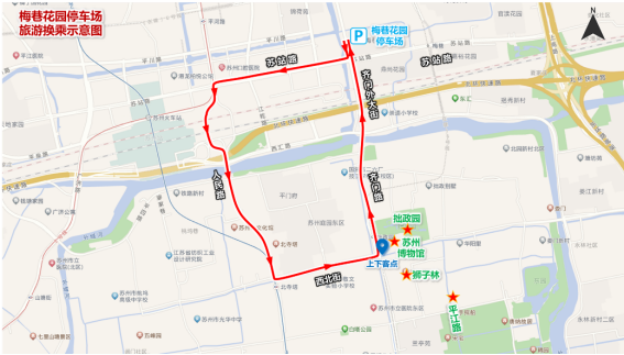 循环线路(运行时间10:00-17:00):梅巷花园停车场—齐门外大街—苏站路—人民路—西北街—齐门路(拙政园景区)—齐门外大街—梅巷花园停车场。