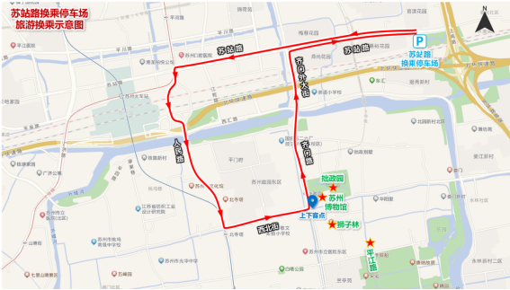 循环线路(运行时间9:30-17:00):苏站路换乘停车场—苏站路—人民路—西北街—齐门路(拙政园景区)—齐门外大街—苏站路—苏站路换乘停车场。