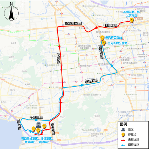 去程线路:苏州站北广场公交枢纽、苏站路、(北环路)跨线桥、北环路、北环快速路、太湖大道快速路、中环西线、中环西线木东路刘庄路出口下、金枫南路、东山大道、环胥南路(胥口皋峰墓区、仙桥墓区、新麓墓区、清明墓区)