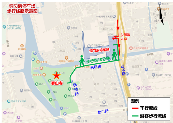 铜勺浜停车场(约800泊位)服务于寒山寺,游客步行进入寒山寺景区(步行时间约10分钟)。