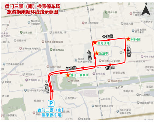 循环线路(运行时间8:00-17:00):盘门三景(南)换乘停车场—盘胥路—新市路(盘门三景景区)—人民路(沧浪亭)—十全街(网红街)—带城桥路(网师园)—竹辉路—新市路—盘胥路—盘门三景(南)换乘停车场。