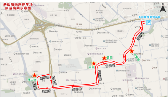 循环线路(运行时间8:00-17:00):茅山塘换乘停车场-广济路(山塘街)-留园路(留园)-桐泾北路(西园)-金门路-枫桥路(寒山寺)-西环路-金门路-桐泾北路-留园路-广济路-茅山塘换乘停车场。