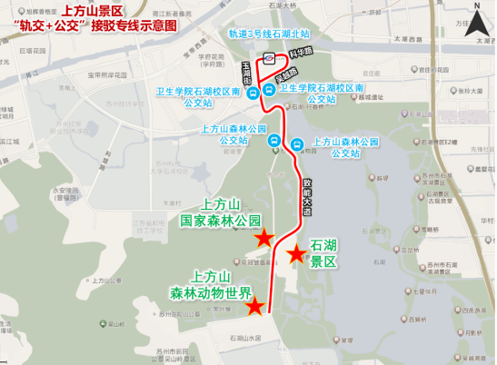 循环线路(运行时间8:30-18:00):轨道3号线石湖北站—科华路-玉湖街-上方山国家森林公园—致能大道—上方山森林动物世界—致能大道—上方山国家森林公园—玉湖街—吴越路—科华路—轨道3号线石湖北站。