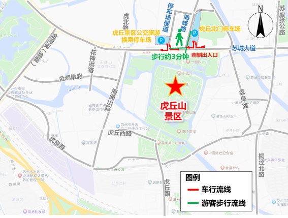 虎丘景区公交旅游换乘停车场(约800泊位)、虎丘北门停车场(约400泊位)服务于虎丘山景区,游客步行进入虎丘山景区(步行时间约3分钟)。