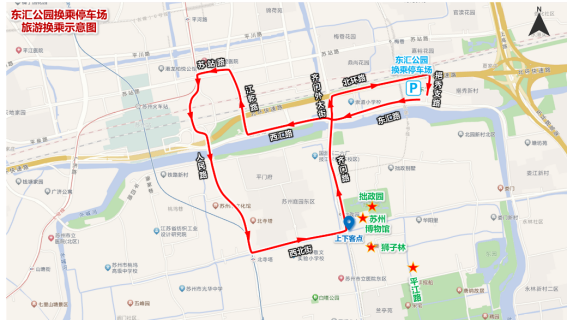 东汇公园换乘停车场(588泊位)、苏站路换乘停车场(297小客泊位+110大客泊位)、梅巷花园停车场(约200泊位)服务于东北片区的拙政园、苏州博物馆、狮子林、平江路等景点,由苏州公交专线串联换乘停车场和各景区。