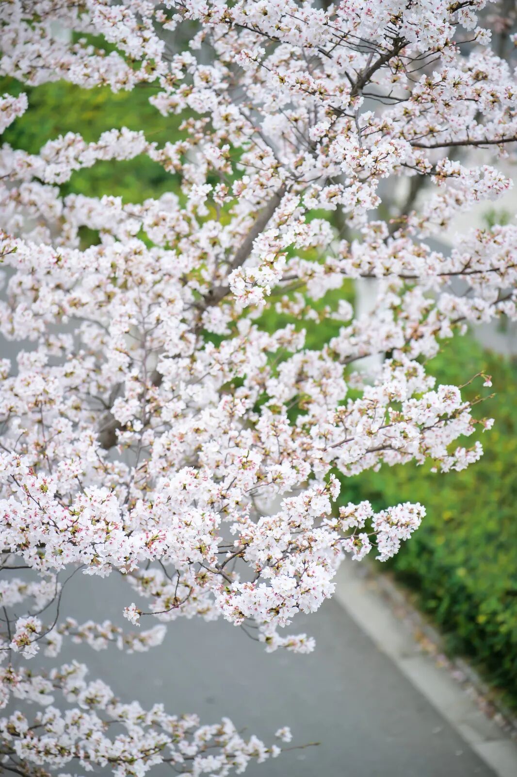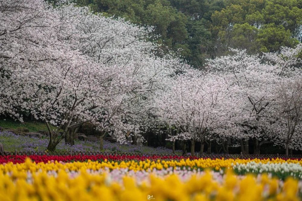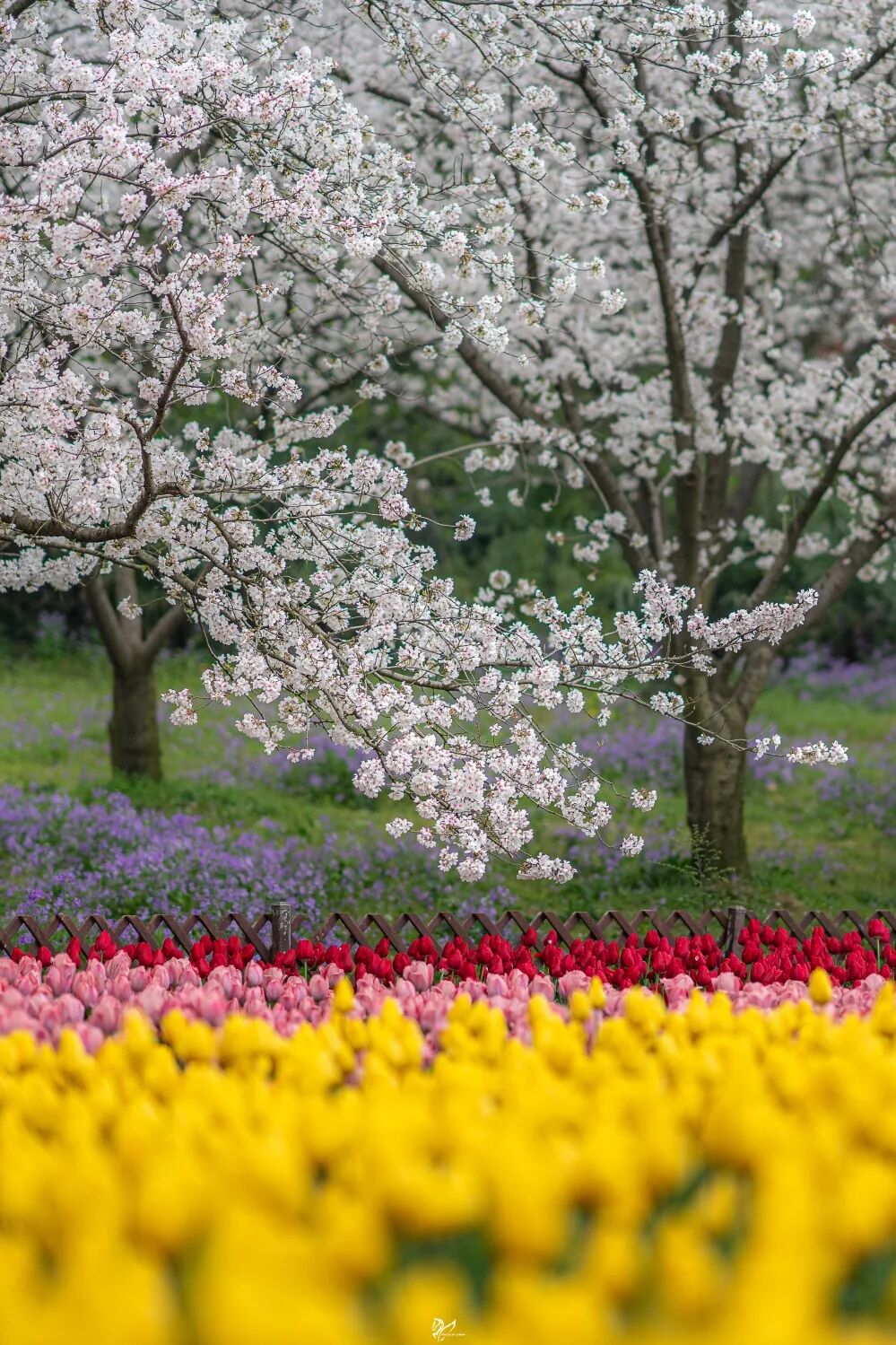 满地郁金香的风车草坪旁,一抬头就是大片樱花~这里开的是染井吉野,初开粉红,盛开后变为雪白。与艳丽的郁金香形成鲜明对比,美得令人心动。