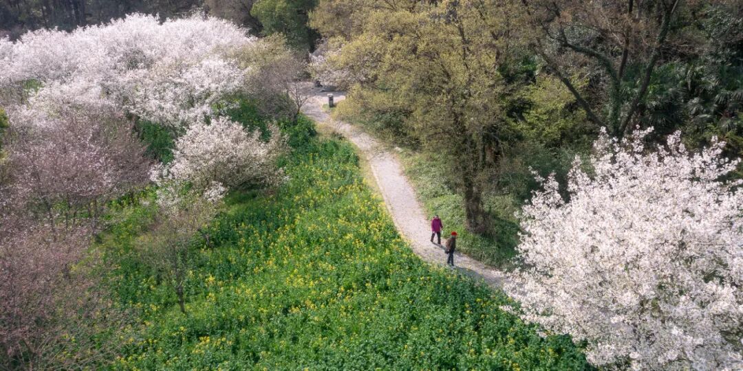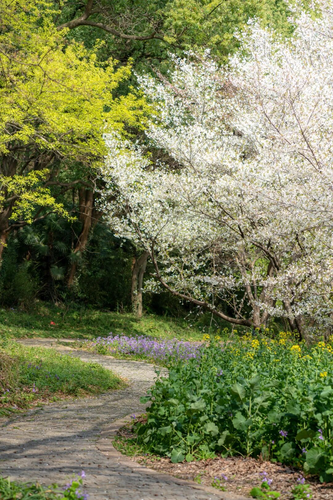 葆光亭位于孔雀园油菜花田附近,四周种植了大量的大岛樱。这里小路蜿蜒,安宁静谧,景色优美,适合闲坐。