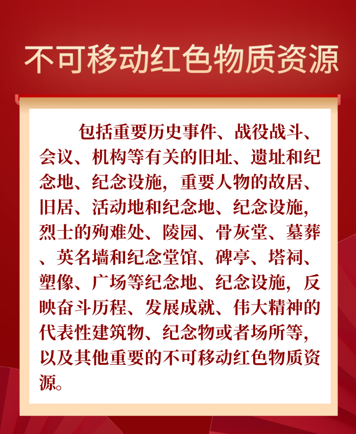 条例首先规定了红色资源概念,即中国共产党领导全国各族人民在新民主主义革命时期、社会主义革命和建设时期、改革开放和社会主义现代化建设新时期、中国特色社会主义新时代形成的具有重要历史价值、纪念意义、教育功能的物质资源和非物质资源,并分类列举加以明确。同时,授权省政府制定红色资源调查认定办法,对经调查认定的红色资源列入名录予以保护。