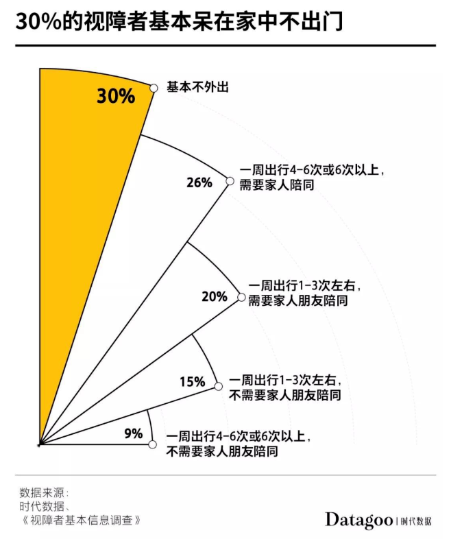 据时代数据公布的《视障者基本信息调查》,30%的视障者基本不外出;46%的视障者每周外出,需要家人朋友陪同;只有24%的视障者每周外出且不需要陪同。