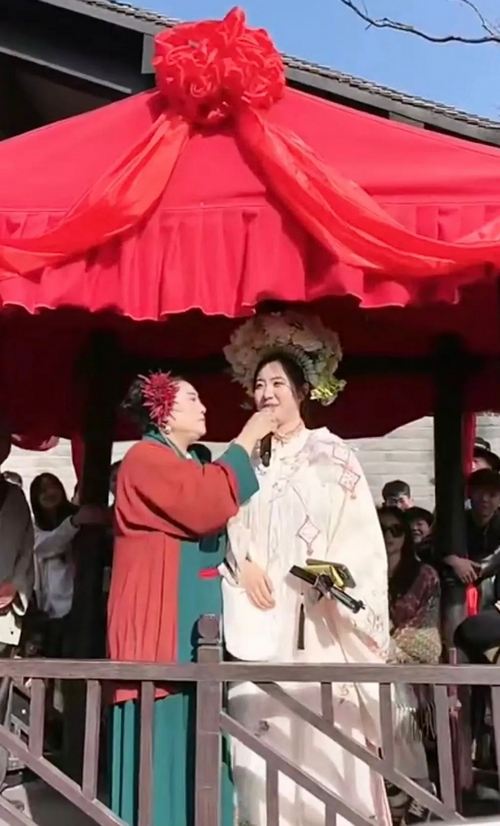 人群之中,王婆正在主持着她的著名节目——《王婆说媒》,在场的观众只要是有相亲需求的,都可以上台,让王婆帮忙介绍对象,场面堪比线下版·大型相亲节目·非诚勿扰。
