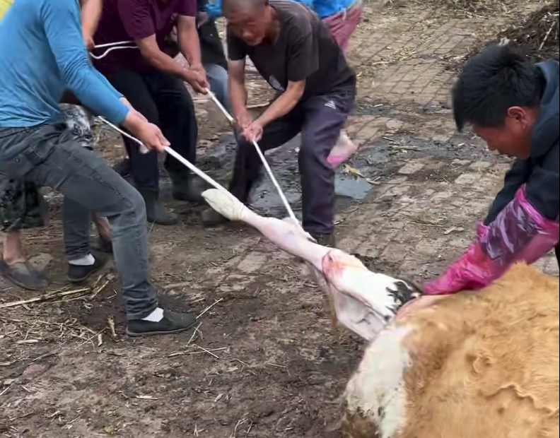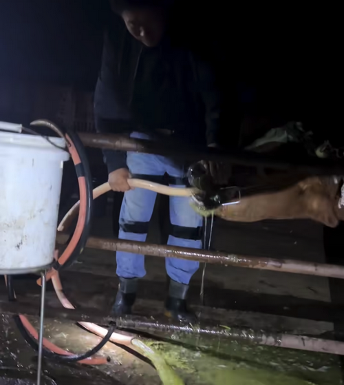 龙兽医立刻赶到养牛户家里,抄起水管,往牛嘴里一通塞,给它灌水洗胃,来来回回十好几遍,接着又牵着牛到处走动,用木板给牛按揉肚子。
