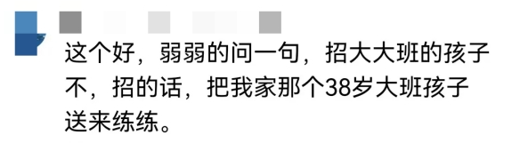 “招大大班的孩子不?招的话,把我家那个38岁的孩子送来练练。”
