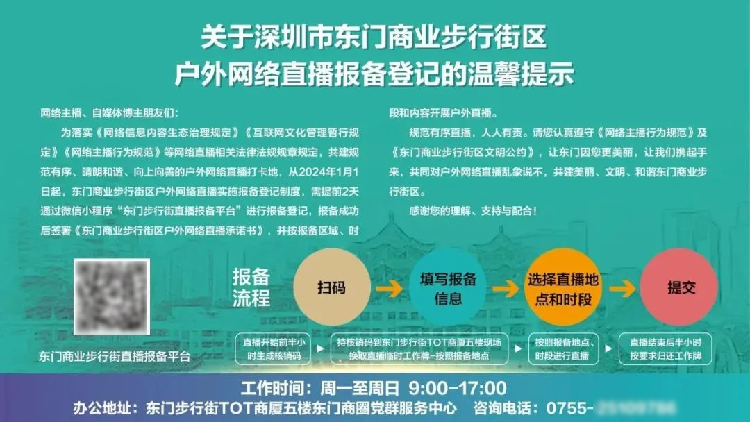 今年1月15日,东门正式开始执行“直播报备”的,凡是要在东门直播的主播,都必须进行报备,并遵守直播规范。