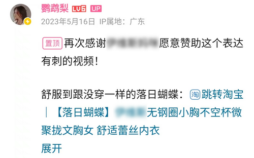 但是人家也不纯粹是“造福女性”“为爱发电”,人家总归还是要“恰饭”的。所以“鹦鹉梨”在那条爆款视频的评论区,置顶了一家内衣店的广告。