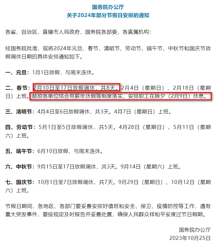 根据国务院办公厅今天最新公布的《2024年部分节假日安排的通知》,2024年春节将从2月10(大年初一)开始放假,共计8天。