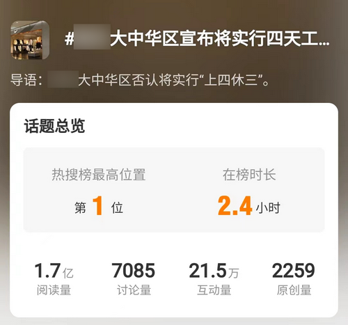 还有前两天上了热搜的#某品牌大中华区宣布将实行四天工作制#,虽然该品牌澄清,不是上四休三,而是周五可居家办公,不少网友还是表示:羡慕了。