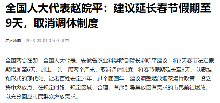 全国人大代表赵皖平建议:取消调休制度,让春节法定假期放5天,凑出一个9天长假。