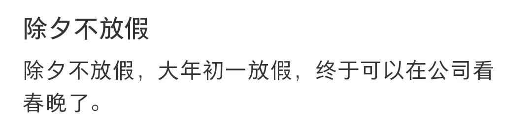 看得出来,大家都对“除夕不放假”这事,颇有些意见,相关的吐槽段子也满天乱飞。