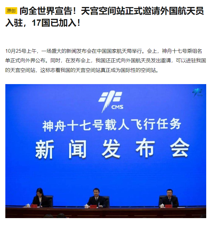 另外,根据中国空间站负责人的透露,美国的技术没有达到进入中国空间站的要求。