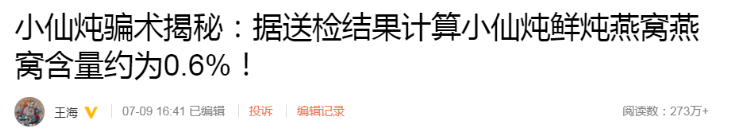 2020年7月,知名打假人王海发布文章《小仙炖骗术揭秘:据送检结果计量小仙炖鲜炖燕窝含量约为0.6%》,揭露辛巴直播带货的燕窝其实就是糖水。
