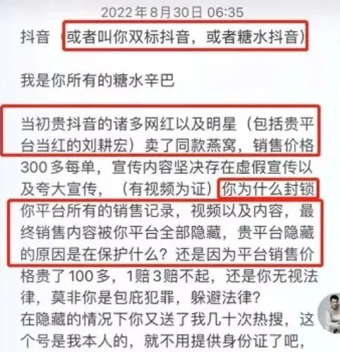 在控诉刘畊宏的长文里,辛巴自称“糖水辛巴”,这个外号源自3年前的“糖水燕窝”事件。