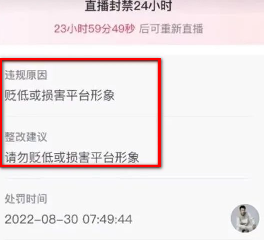 随后不久,平台以“贬低或损害平台形象”为由,将辛巴封禁,勒令其在封禁24小时后才能复播。