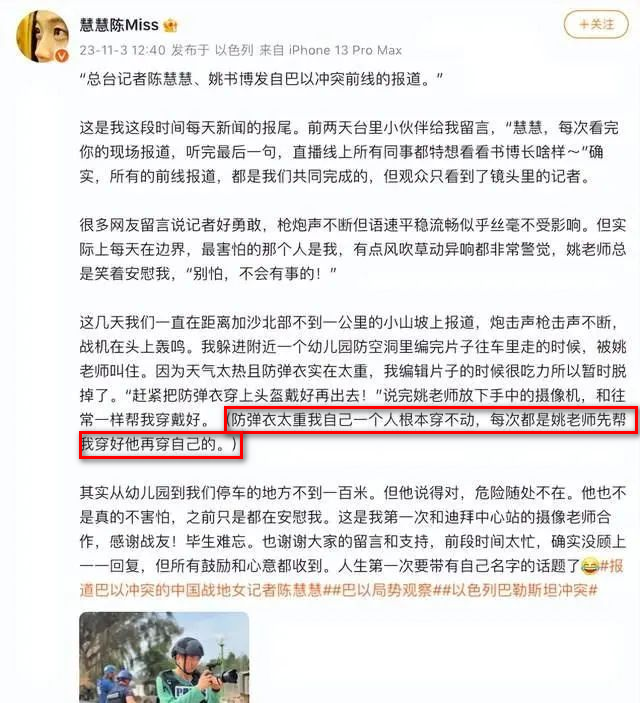 11月5日傍晚,陈慧慧发文:“顺利进入约旦境内了。我和姚老师29天巴以边界报道算是告一段落,但我们驻耶路撒冷的两位记者还在坚守岗位,总台新的增援梯队即将就位。我们也会准备好随时重返前线,和战友们一起并肩作战!”
