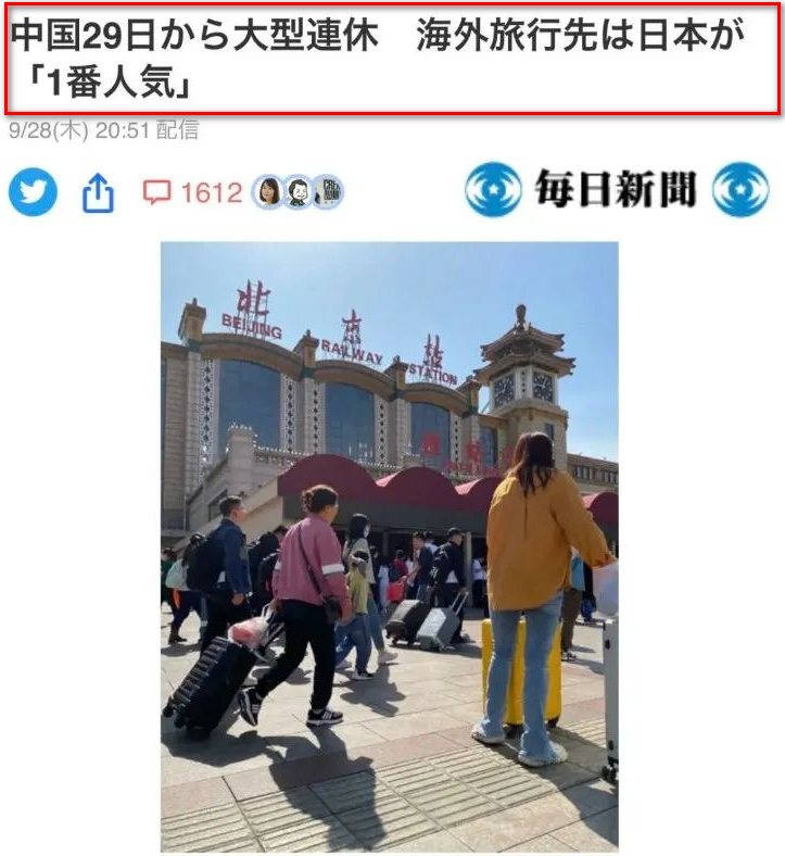 日本《每日新闻》称:此次国庆中秋长假,日本是中国游客海外旅游选择最多的国家。