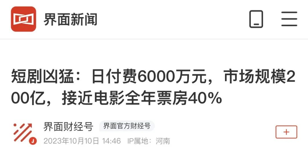 根据界面新闻的报道,目前国内全平台的付费短剧每日充值消费已经在6000万元左右,遇到国庆等节假日档期,峰值甚至超过1亿元。