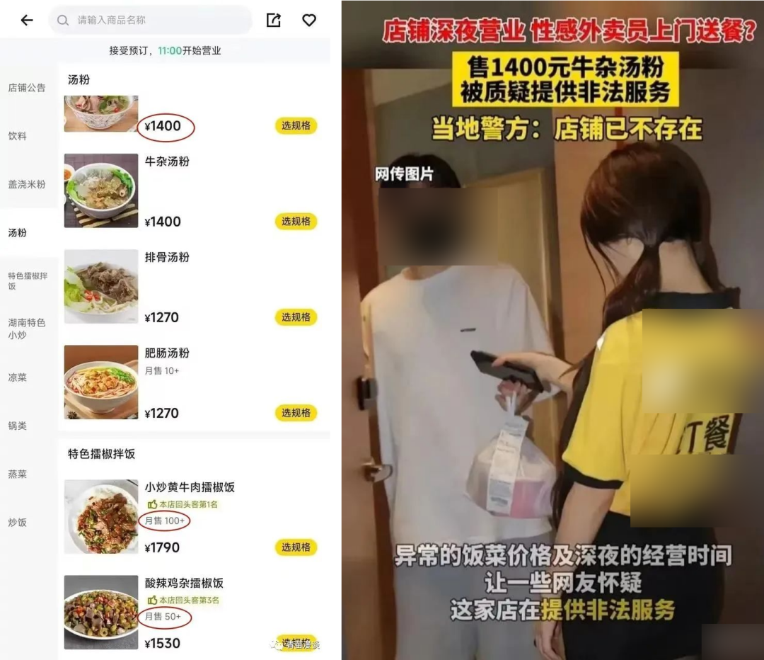 11月初,“小逗逗”冒充外卖员摆拍的照片在网上流传,随后有人将她的擦边照片,与外卖平台上售价高达1400元的牛杂汤粉消息拼凑在一起,称其为“新型卖淫模式”。