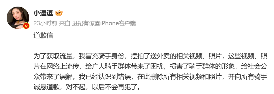 她道歉说:“为了获取流量,我冒充骑手身份,摆拍了送外卖的相关视频、照片……给广大骑手群体带来了困扰,损害了骑手群体的形象,给社会公众带来了误解……”