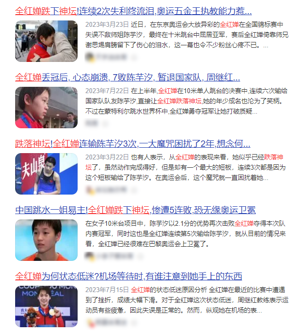 然而,短暂的风光之后,多篇“全红婵跌落神坛”的报道迅速覆盖之前那些夸赞她的报道。