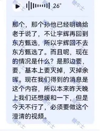 值得注意的是,一张网传聊天记录显示,俞敏洪目前面临CEO孙东旭和主播董宇辉“二选一”的处境。