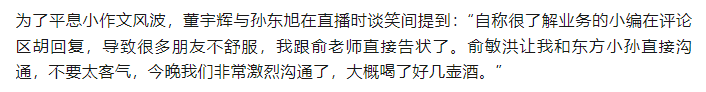 随后,董宇辉和东方甄选CEO孙东旭在直播间回应了这件事:“自称很了解业务的小编在评论区胡回复,导致很多朋友不舒服……”