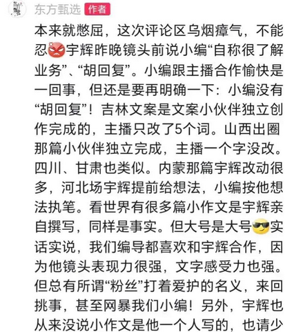 就算小作文真是小编写的,但他不应该未和公司商量便将此事公之于众,引起粉丝不满,也不应该任性地与董宇辉和公司在网上继续“纠缠”。