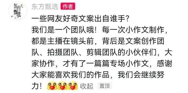 在一条“吉林之行”相关视频下,东方甄选小编置顶了“宣传文案出自谁手”的解答评论:“每一次小作文制作都是主播在镜头前,背后是文案创作团队、拍摄团队、剪辑团队的小伙伴们,大家协作,才有了一篇篇专场小作文”。
