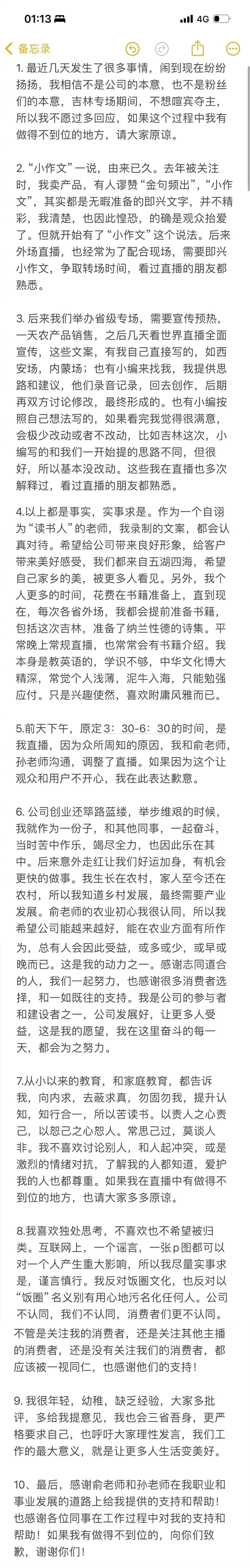 13日凌晨,董宇辉发长文再次回应了这件事,并向大家道歉。