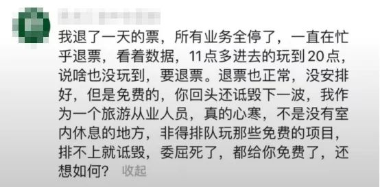 可没过多久,便有人嚷嚷着,要找景区退票,在他的带动下,越来越多的人开始要求退票。