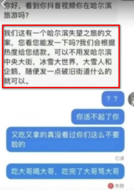 一位网友爆料:网上有一帮团伙到处寻找在哈尔滨旅游的游客,然后花钱让他们发一个“哈尔滨失望之旅”的文案,并配上各种破旧的街道照片。