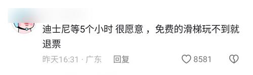 大家在博主评论区留言最多的一句话是:“迪士尼等5个小时很愿意,免费的滑梯玩不到就退票。”